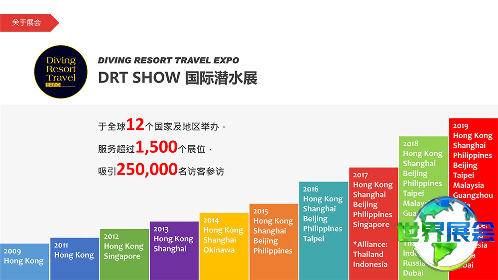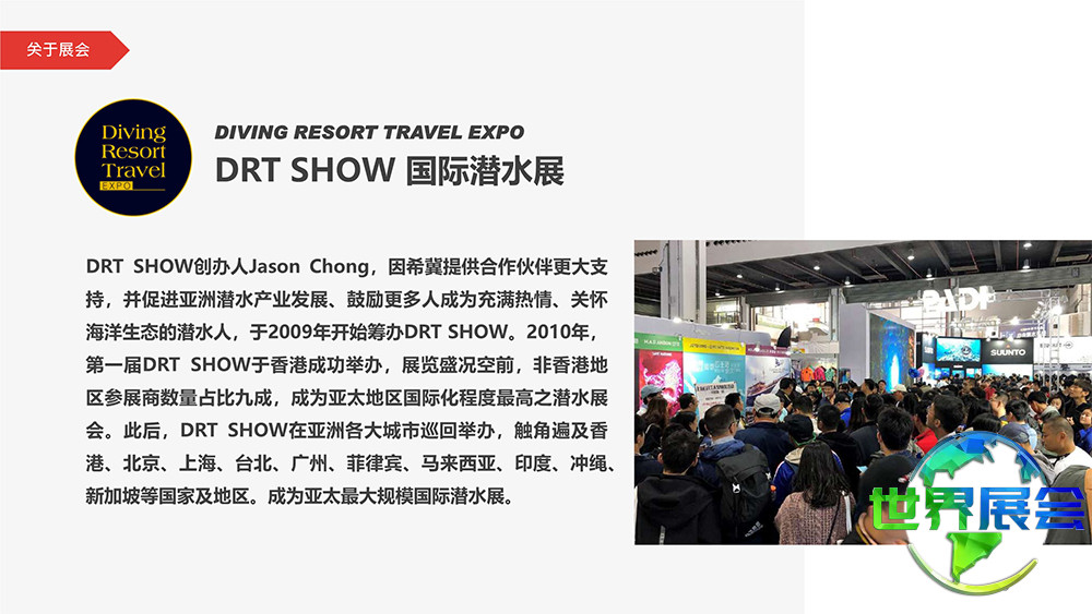 DRT取自潜水(Diving)、度假(Resort)、旅游(Travel)三个英文单词的首字母,完整名称为“国际潜水暨度假观光展”。创始人Jason Chong出于为合作伙伴提供更多支持、推动亚洲潜水行业进步、激励更多人成为热爱海洋并关注生态的潜水者的初衷,于2009年启动DRT SHOW的筹备工作。首届DRT SHOW于2010年在香港圆满落幕,展会盛况非凡,非香港地区的参展商比例高达九成,使之成为亚太地区最具国际影响力的潜水展览。