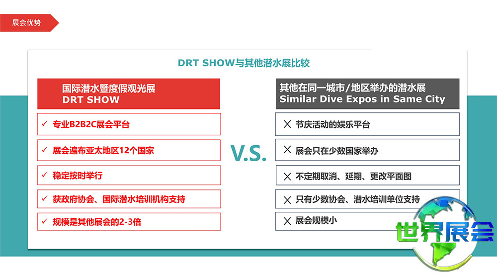 北京国际潜水及度假观光展(DRT SHOW)坚持国际化、多样化、年轻化与专业化的理念,着力满足行业需要,将展会塑造成一个充实的B2B2C互动平台。参展商类型包括设备生产商、度假村与船宿运营商、专业潜水教育机构以及官方旅游部门。本次DRT SHOW北京站有幸获菲律宾国家旅游局参与,十余家菲律宾潜水度假村与航空公司将跨越三千多英里抵达中国,呈现精彩的乐队演出、互动游戏以及奖品丰富的抽奖环节,让我们以热情迎接他们的到来。