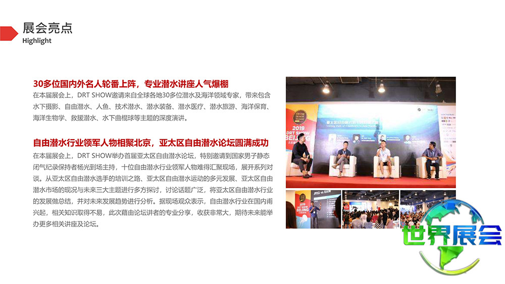 北京国际潜水及度假观光展(DRT SHOW)作为一个关键的区域性盛会已收获热烈反响,有效推动了品牌建设并获得了优质参展商的鼎力相助。同时,它汇聚了潜水装备制造商、水下运动器材供应商、潜水度假村、旅游机构、海洋环保团体及潜水协会。