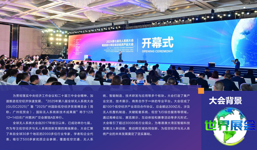 广州全球无人系统大会(GUSC)始于2017年,是一个聚焦低空经济与无人系统创新发展的顶级行业盛会。大会汇集了全球超过30个国家和地区的2000余位行业专家、学者及企业代表,内容涵盖低空交通、无人系统、智能制造、技术研发与应用等多个领域。