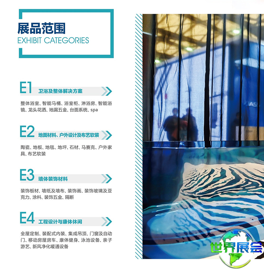 墙面材料及精品设计展区:装饰板材、装配式整装定制、墙纸壁布及装饰膜、整体软装及装饰画、装饰艺术玻璃、软瓷、涂料、装饰五金、设计公司等