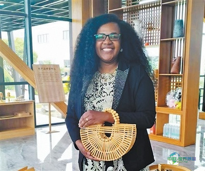 “小米”向大家展示湖南沅江出产的竹编手提包。本报记者 杨 迅摄影