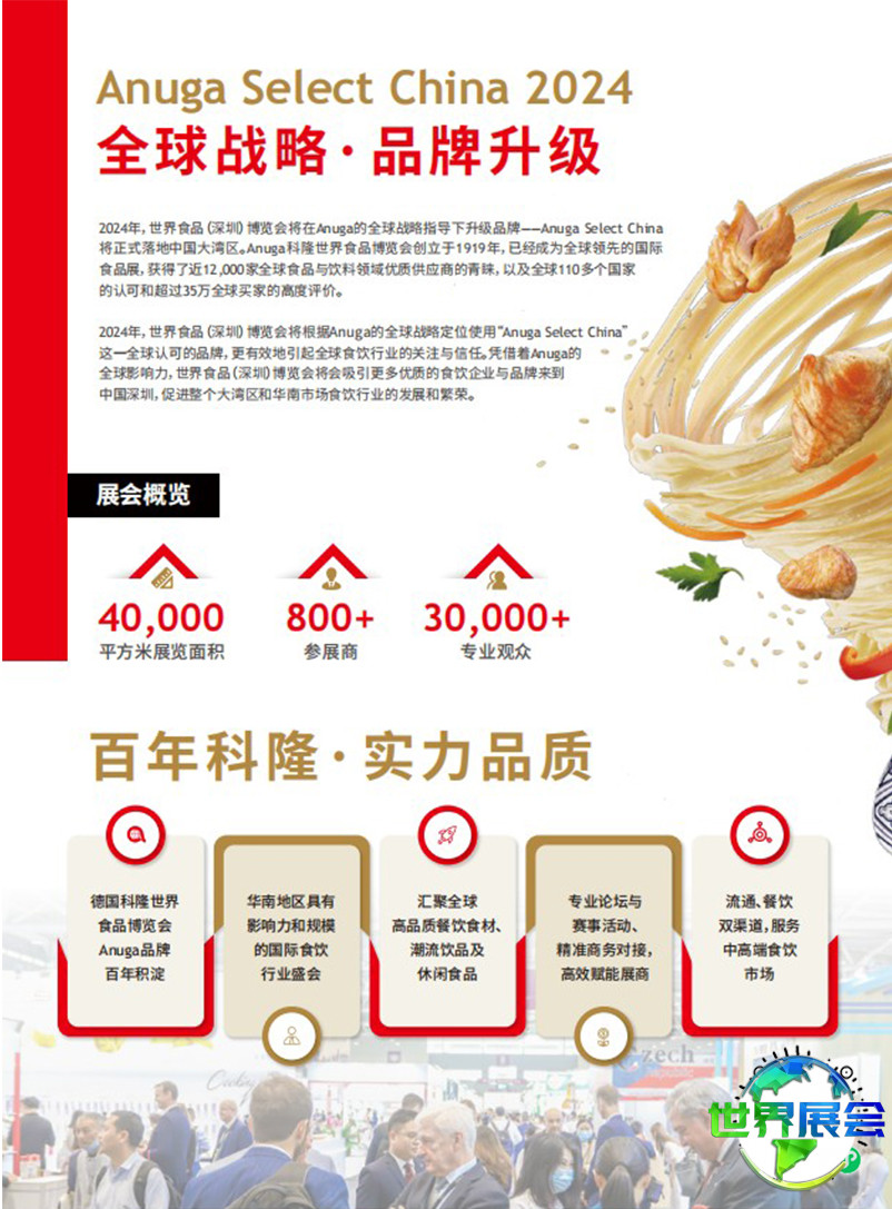 世界食品深圳博览会(Anuga Select China)是首个战略性聚焦中国华南地区食品饮料市场的国际性展览。展会由科隆展览、中国食品土畜进出口商会及深圳市零售商业行业协会联合主办,并得到全球顶级的德国科隆世界食品博览会(Anuga)的鼎力支持。
