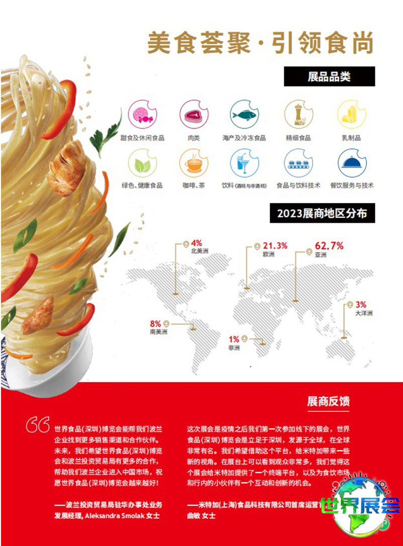 本信息由中欧世界展会网团队编辑整理。我们是一个整合全球展会时间地点、门票购买、展位申请、设计搭建服务的平台,为您提供深圳食品展展位预定支持。