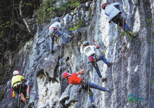 2023年始祖鸟国际攀岩山地课堂(阳朔)现场,参与者正在进行攀岩训练