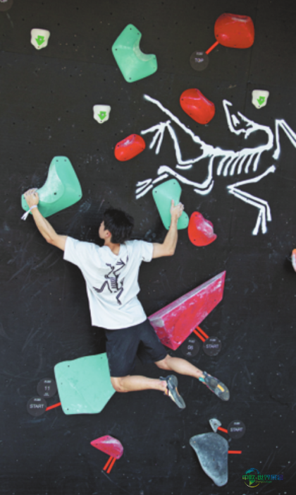 潘愚非正在始祖鸟国际攀岩山地课堂体验抱石攀岩线路