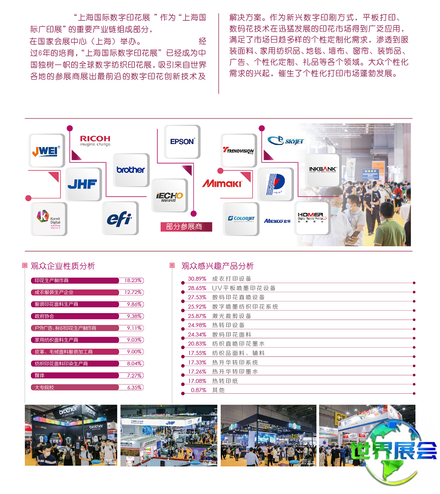 上海国际数字印花展览会(DIGITAL TEXTILE PRINTING EXPO)是在全球范围内具有高度声誉的数字印花专业展会。与之同期举办的还有上海国际广印展览会。展会致力于吸引更多国内外顶尖的数字印花工业品牌商参与。