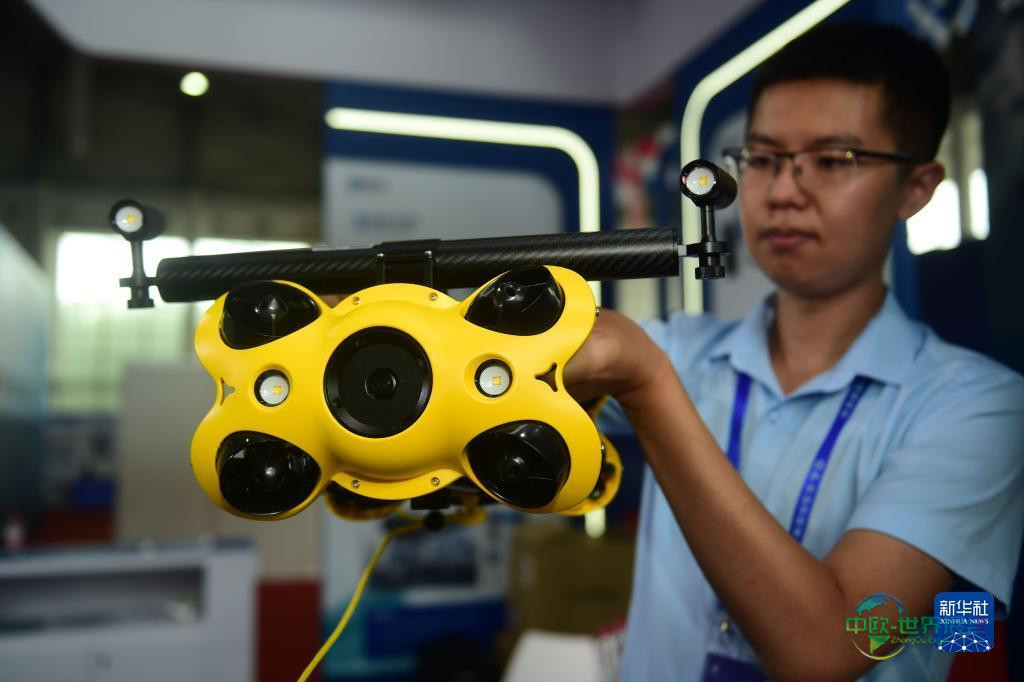 7月12日,参展单位的工作人员演示了用于船舶检测的智能水下机器人。