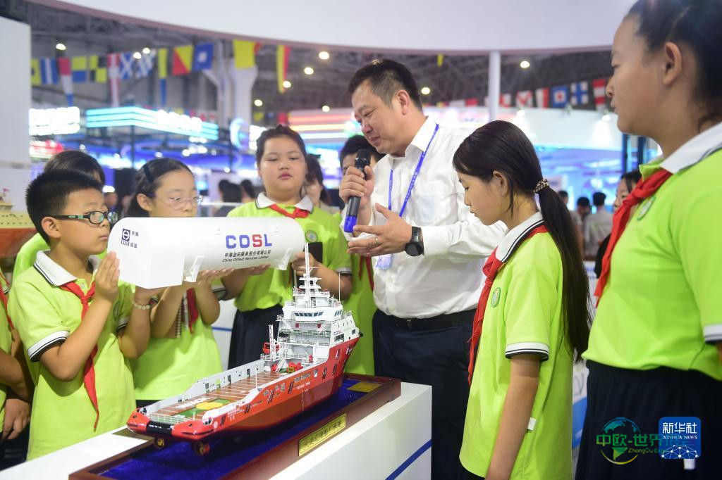7月12日,小学生们在航海科技博览会上观摩以LNG清洁能源为动力的船舶模型。