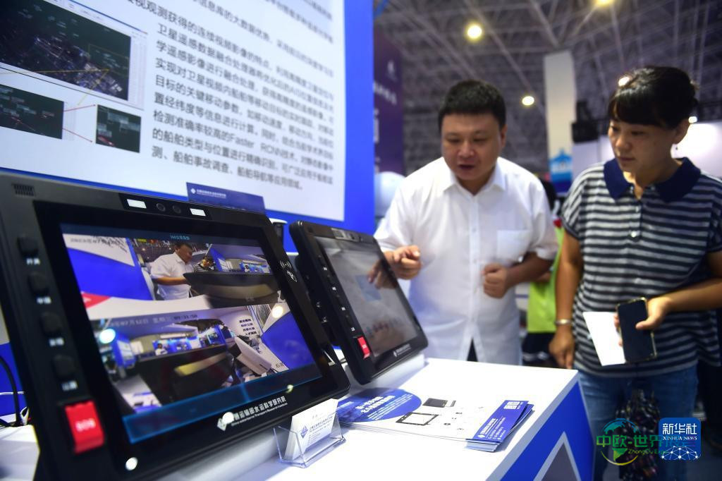 7月12日,参展单位工作人员(左)正在向参观者讲解新一代多功能北斗船载智能终端设备。