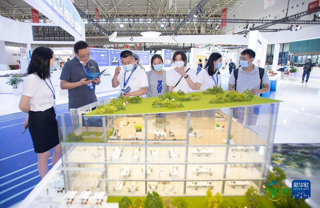 8月5日,访客在湖北三江航天万峰科技发展有限公司展台进行参观。