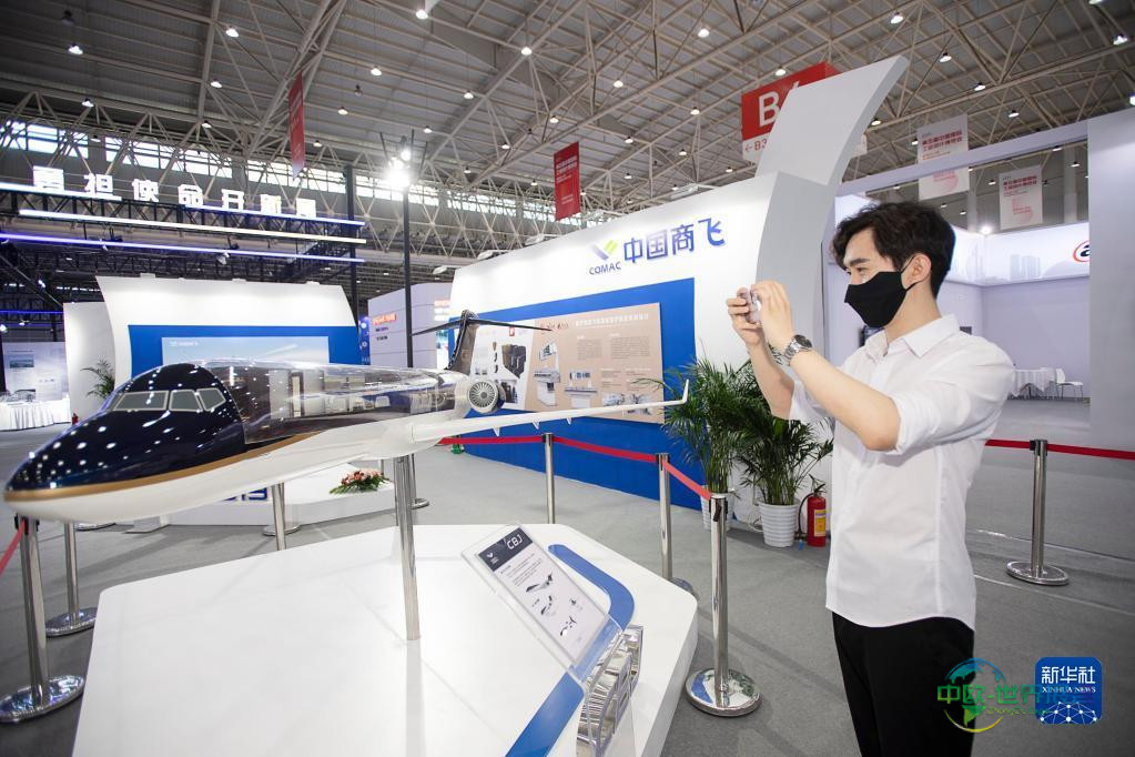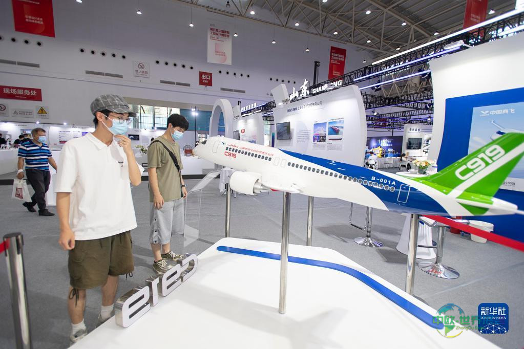 8月5日,参观者在中国商飞展区驻足观看。