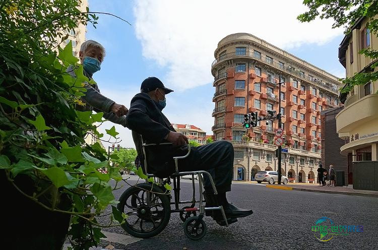 一位乘坐轮椅的老人经过武康大楼。视觉中国 资料图