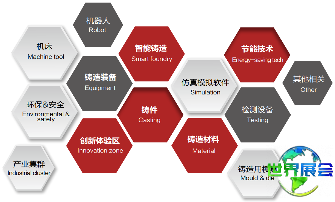 铸造配套领域:环保处理设备、清洁生产与废弃物处置技术、安全生产与环境管控、铸造工艺技术、计算机应用方案、铸造行业专用机器人等