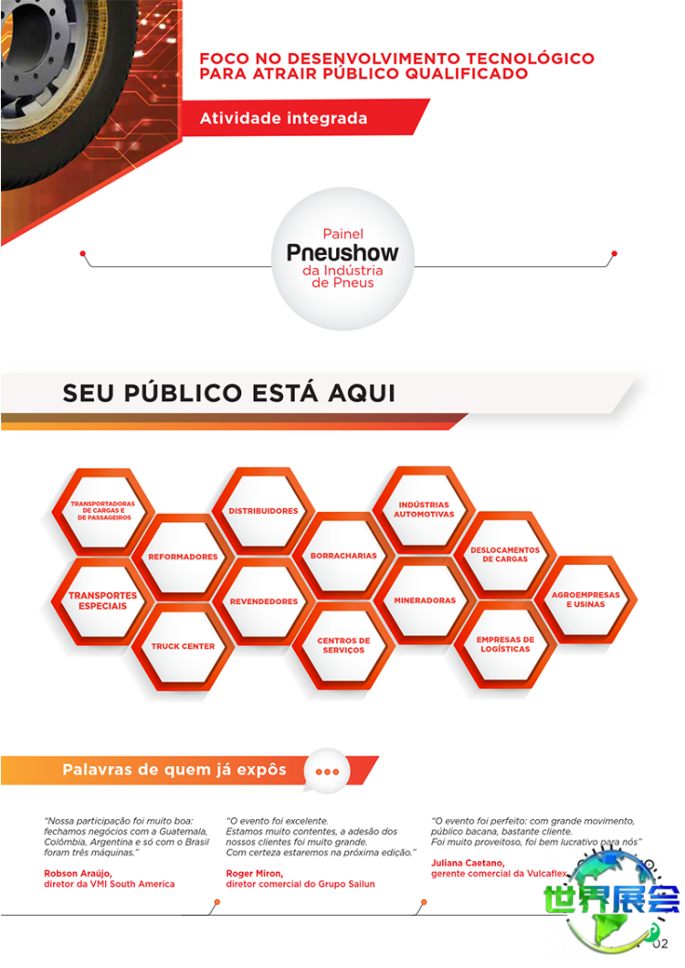 巴西圣保罗轮胎展PneuShow上届展会总面积达24000平方米,参展商448家分别来自中国、泰国、智利、美国、西班牙、中国台湾、迪拜、哥伦比亚、德国等地,参观者数量达到19500人。展会现场还将组织多场会议,共同研讨轮胎行业的未来发展方向。