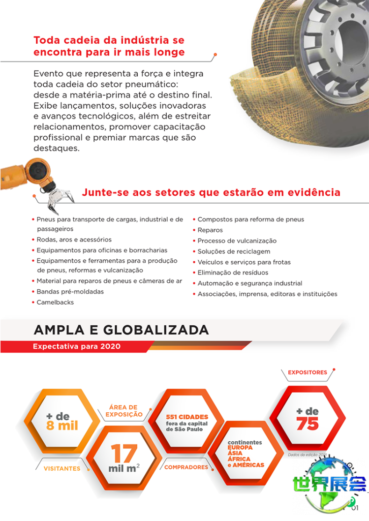 巴西圣保罗轮胎博览会(PneuShow)是巴西乃至整个南美地区规模最大、最具专业性的轮胎及其相关产品展览。该展与巴西圣保罗塑料橡胶展(Expobor)同期举行。自1996年创办以来,从首届开始便成为引领行业和刷新市场趋势的重要展会之一,如今也已发展成为巴西顶尖的橡胶技术及设备展览会。