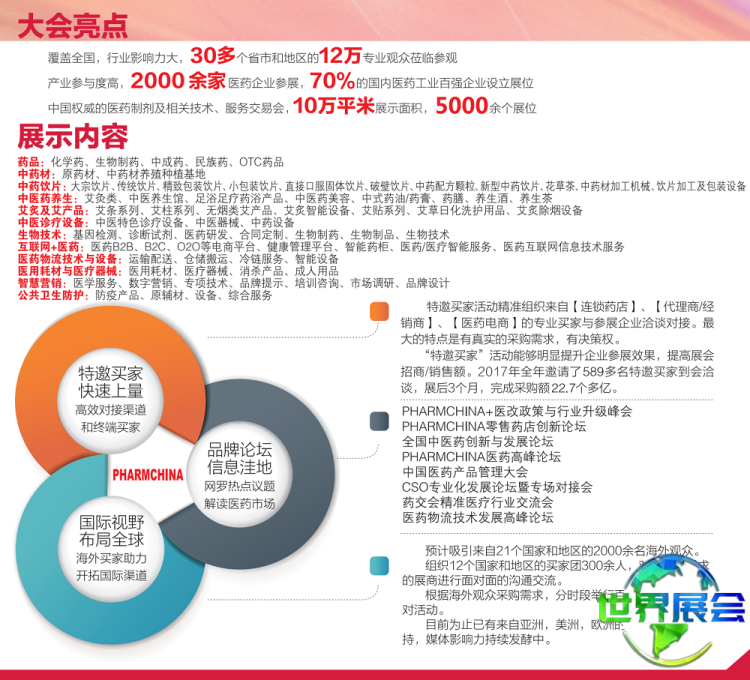 本届上海药交会-全国药品交易会(PHARMCHINA)的展品覆盖化学药、中成药、中药饮片、配方颗粒、非处方药、医用耗材、医疗器械、中医诊疗及中医药设备、个人护理产品、成人用品、医美融合产品、医药研发供应链、医药物流技术与设备、互联网+医药、智慧营销等多个细分产业集群。“专区专展”的模式有效聚焦了目标观众群体。