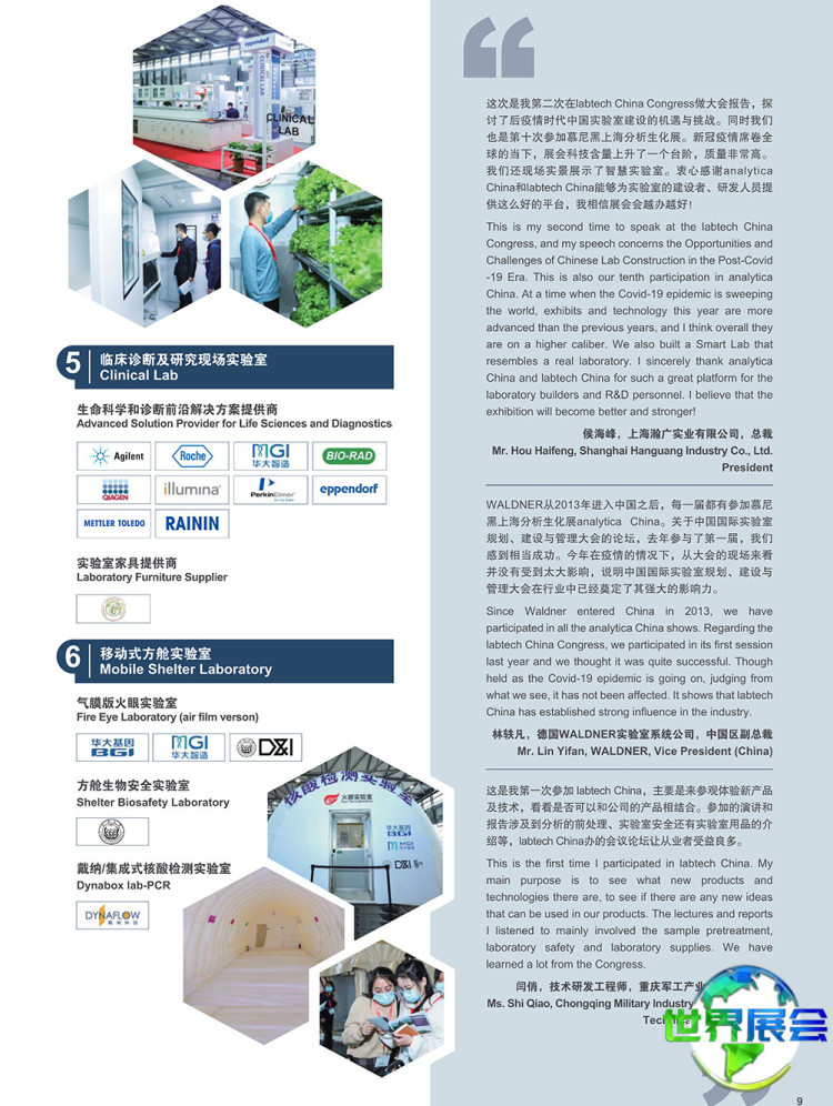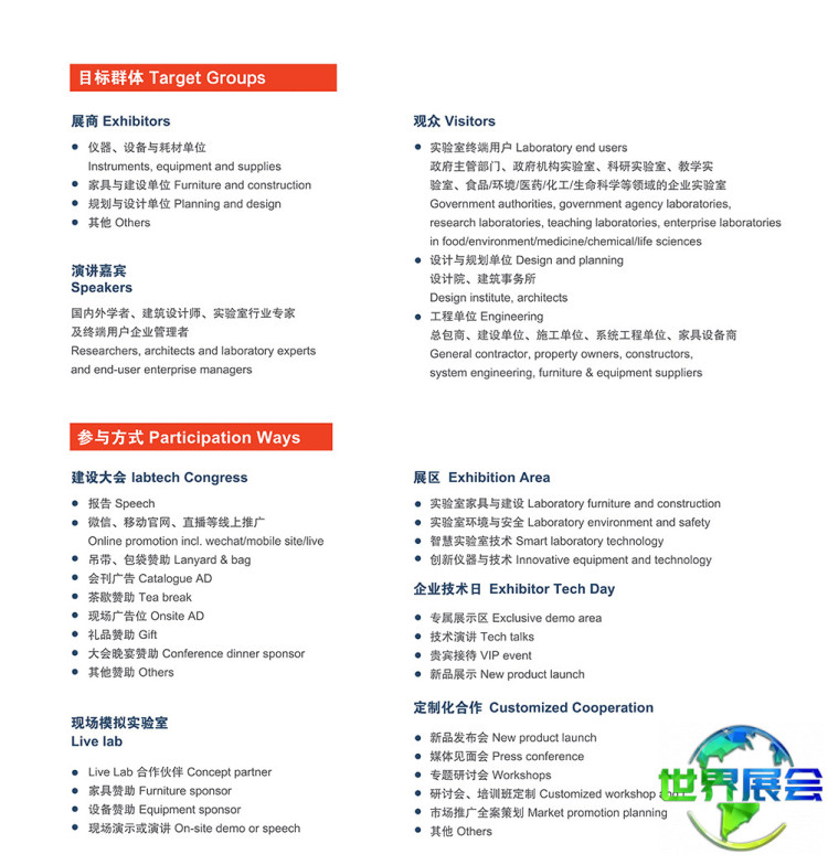 实验室设备与技术:实验室仪器与机械、实验室自动化系统、实验室数据库与软件、归档管理、实验室工艺技术、实验室家具、化学品及试剂、配件与消耗品、实验室技术服务