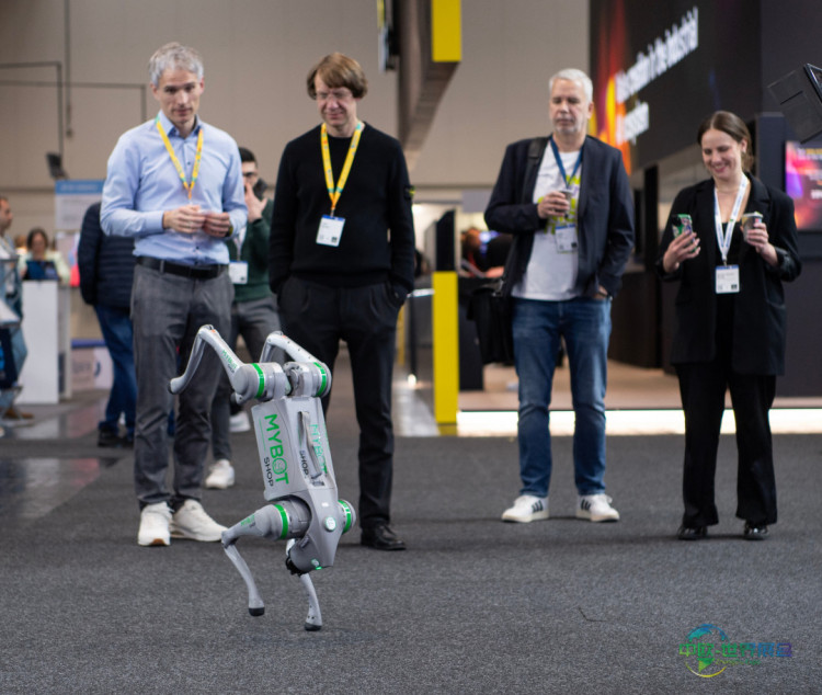 4月20日,观众在德国汉诺威工业博览会驻足观看机械狗的演示。新华社记者 张豪夫 摄