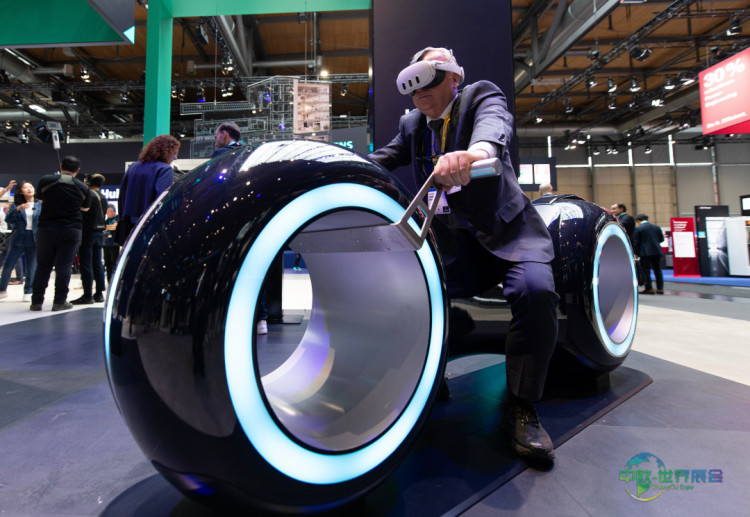 4月20日,一名男子在德国汉诺威工业博览会西门子展台体验虚拟现实设备。新华社记者 张豪夫 摄