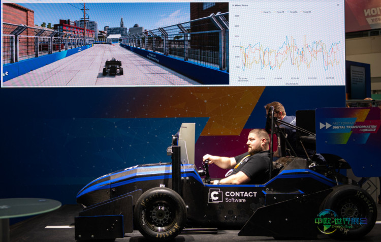 4月20日,一位男士在德国汉诺威工业博览会上尝试一款赛车模拟装置。新华社记者 张豪夫 摄