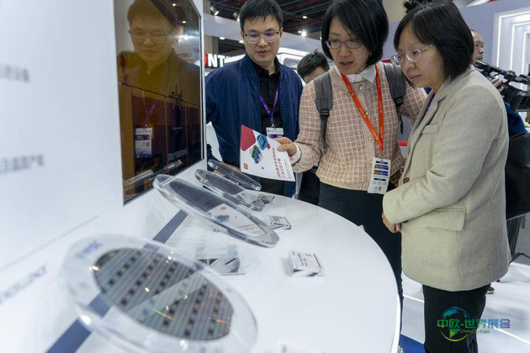 九峰山实验展台上,一位观众正在仔细参观新型化合物半导体晶圆。(湖北日报全媒记者 魏铼 摄)