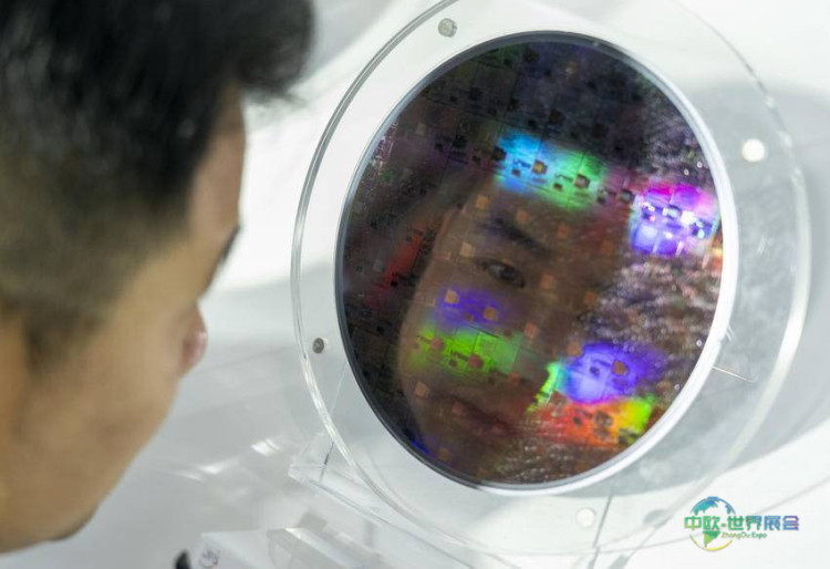 长飞先进展台前,观众正在参观晶圆产品。(湖北日报全媒记者 魏铼 摄)