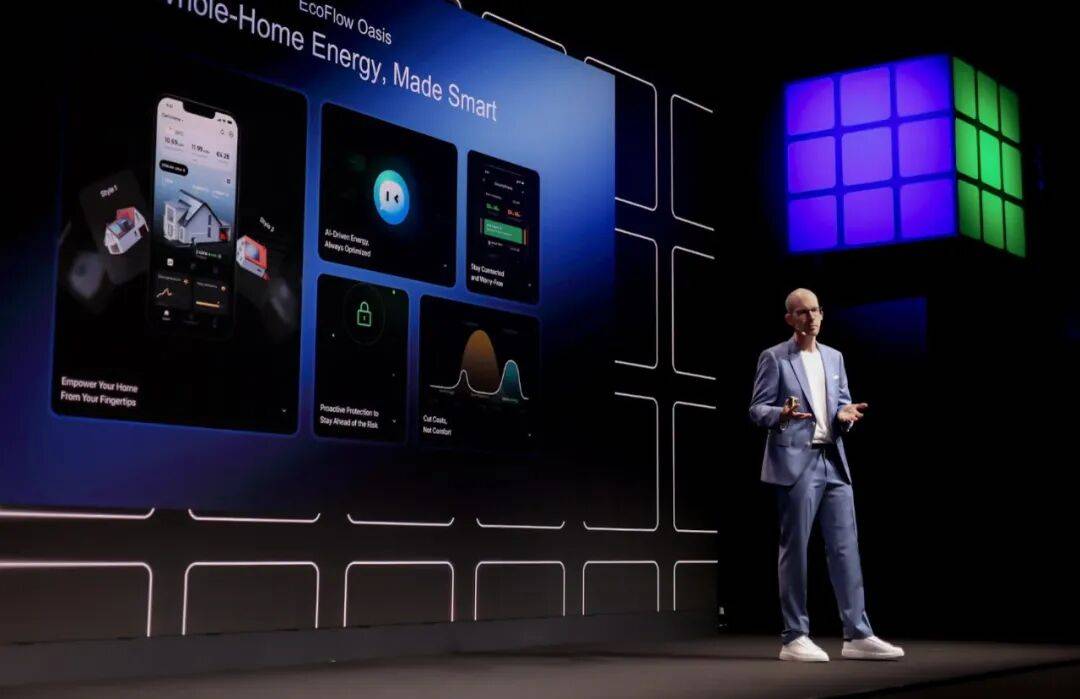 展会现场,最引人注目的是正浩推出的能源“大脑”家庭能源管理系统—EcoFlow OASIS系统,它能够提供覆盖发电、储电、配电与用电全链路的一站式解决方案。