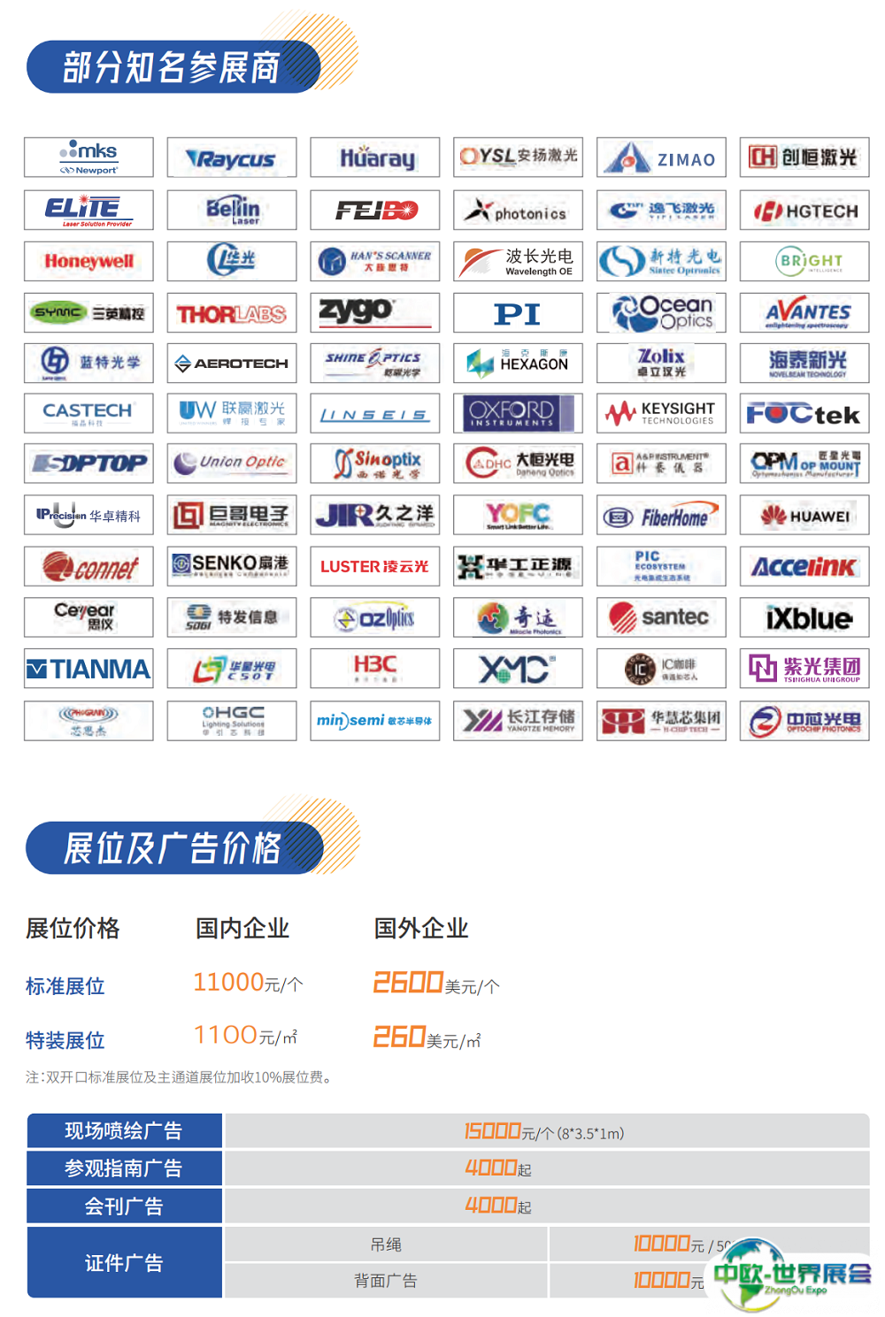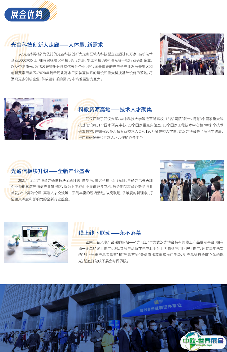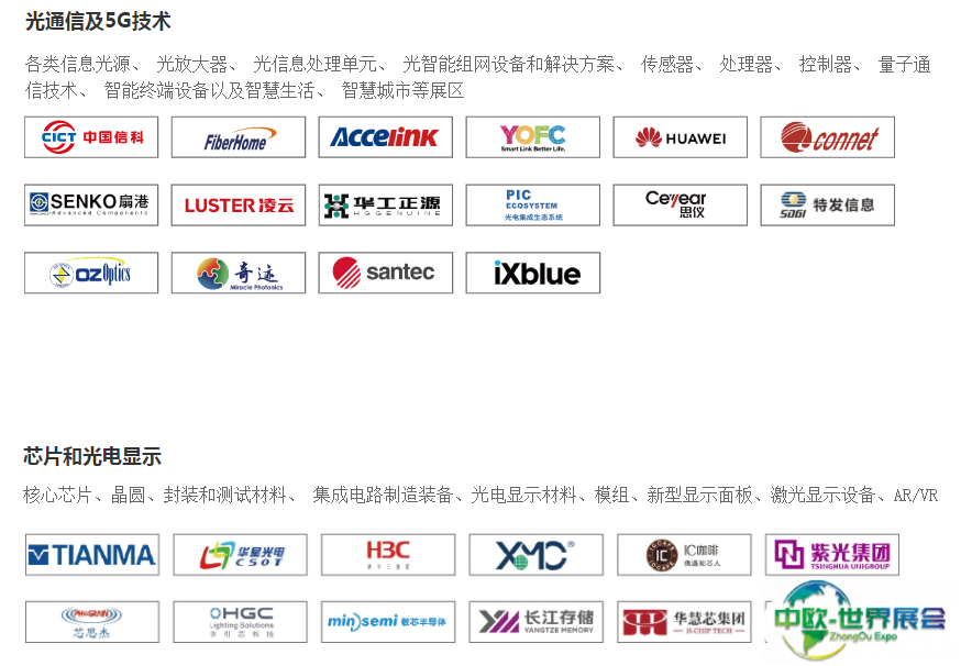 光通信及5G技术:各类信息光源、光放大器、光信息处理单元、光智能组网设备和解决方案、传感器、处理器、控制器、量子通信技术、智能终端设备以及智慧生活、智慧城市等展区