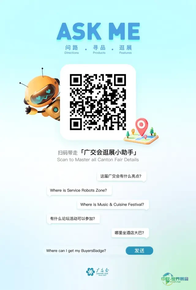 不知道怎么走?没关系,找广交会“逛展小助手”——“ASK ME”智能体,扫码开问,有问必答~