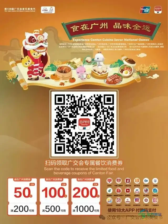 为提升消费体验,广州市商务局联手中国银联持续发放“食在广州”餐饮消费券,广交会客商可定位在广交会展馆D区广交会堂西侧中心广场3公里范围内,通过银联云闪付平台,领取满1000减200元、满500减100元、满200减50元等广交会专场餐饮消费券,可在全市超3000家餐饮美食店使用。