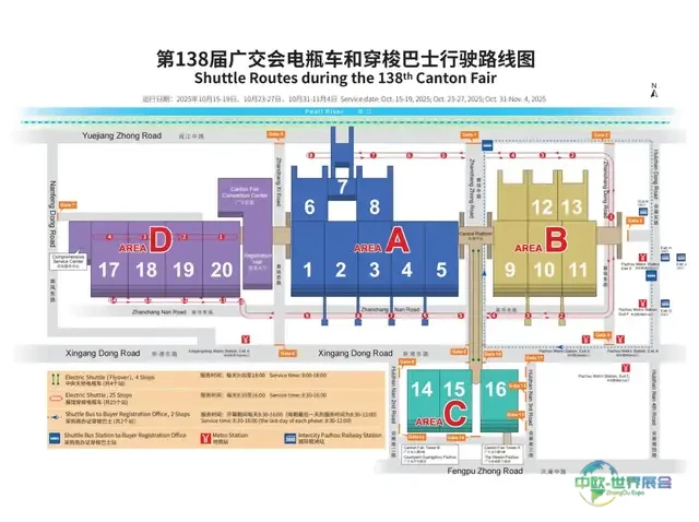 连通1-5号馆(A区)、9-11号馆(B区)、17-20号馆(D区)、广交会堂